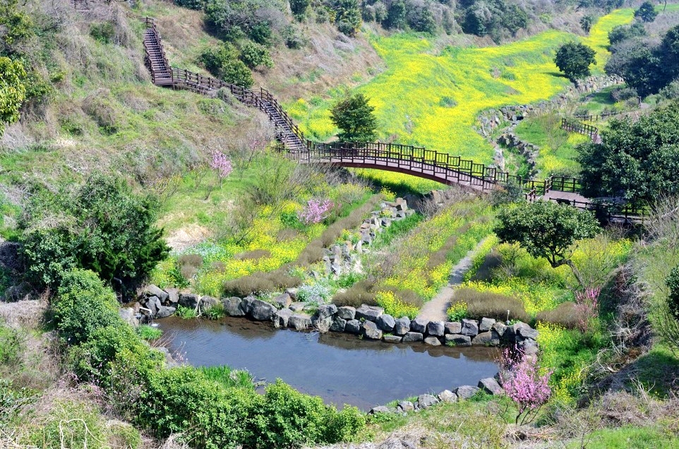 유채꽃길을 따라 천천히 걷다 보면 자연스럽게 미라지 연못이 나타납니다. 계곡 사이에 자리한 이 작은 연못은 주변의 노란 유채꽃과 어우러져 또 다른 풍경을 만들어냅니다.