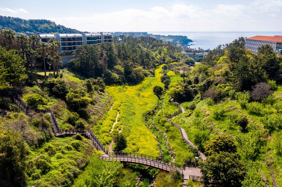유채꽃길을 따라 걷다 보면 자연스럽게 미라지 연못이 나오고, 좌측으로 올라가면 롯데호텔 산책로와 이어집니다. 짧게 걷기에도 좋고, 조금 더 길게 산책하기에도 적당한 코스입니다.