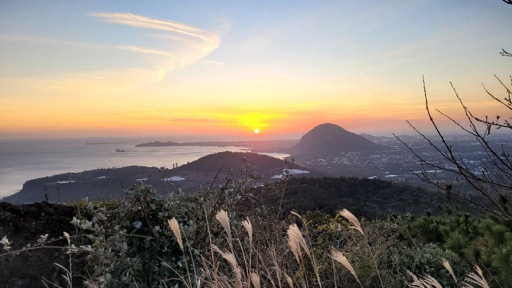 군산오름은 제주에서 손꼽히는 ‘노을 명소’예요. 서쪽 바다를 향해 탁 트인 시야 덕분에 붉게 물드는 석양을 그대로 감상할 수 있어요. 특히 겨울철에는 노을이 더욱 선명하고 강렬하게 비춰져서, 감성 사진을 남기기에도 제격이랍니다. 이곳에서 바라보는 일몰은 한라산, 마라도, 산방산까지 배경으로 담겨 말 그대로 360도 파노라마 뷰를 자랑해요. 현지 주민들도 산책 삼아 자주 찾는 곳이라 너무 붐비지 않게 노을을 감상할 수 있다는 점도 장점이에요 😊