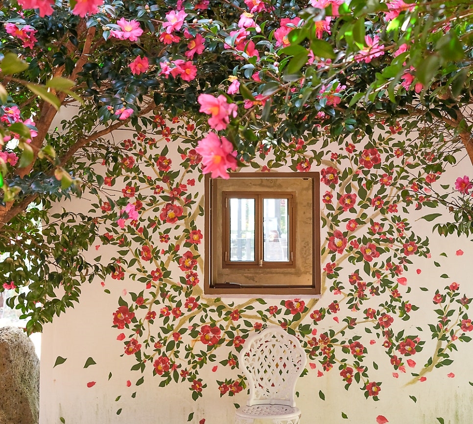 카페 야외에는 동백꽃 벽화 포토존도 마련돼 있어서 실제 꽃과 그림을 함께 담은 사진을 찍을 수 있어 인생샷 명소로도 인기랍니다!