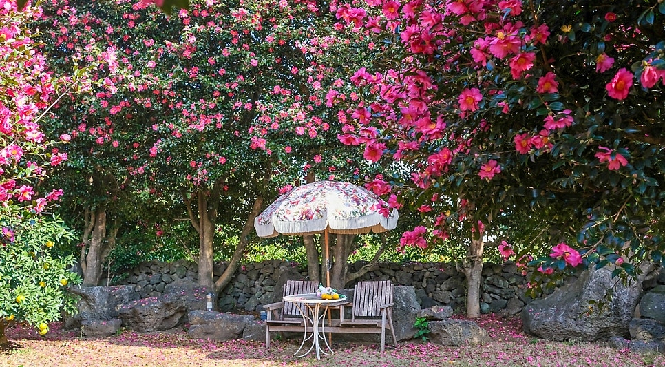 동백 시즌이 되면 전국에서 여행객이 몰리는 이곳! 제주스러운 돌담길과, 나무 아래에서 동백꽃을 감상할 수 있는 아기자기한 공간들이 가득하답니다.