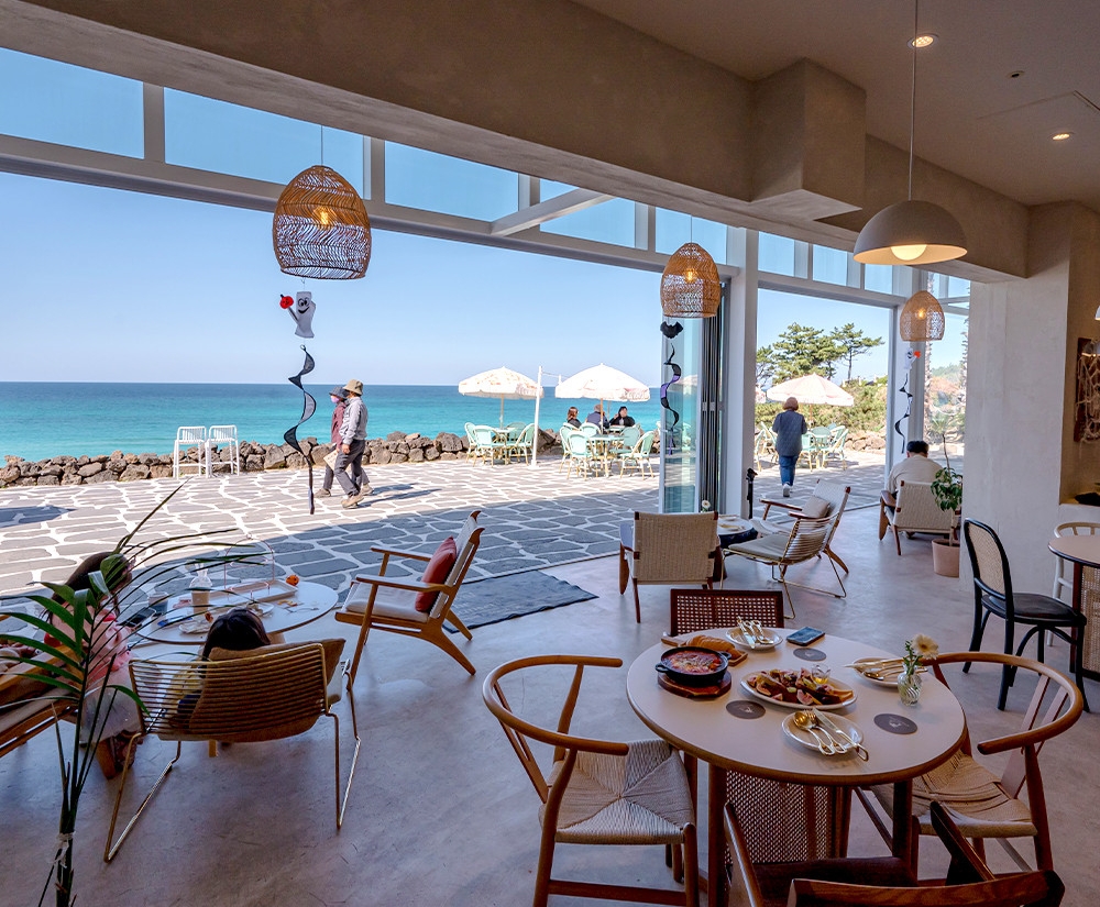 낮에는 에메랄드빛 바다, 저녁에는 제주도에서도 손꼽히는 황홀한 선셋 뷰가 기다리고 있어요. 한담해안산책로와도 바로 이어져 있어서 식사 후 여유롭게 산책도 가능하답니다.