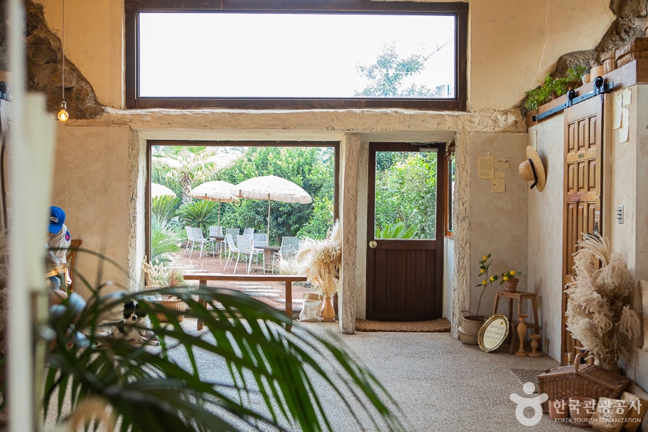 내부로 들어서면 거친 시멘트 벽과 드러난 나무 천장이 우드톤 가구와 조화를 이루며 이국적인 분위기를 자아냅니다. 곳곳에는 거울과 셀카존이 마련되어 있어, 제주에서의 추억을 담을 인생샷 스팟으로도 유명해요. 특히 따뜻한 햇살이 들어오는 오후 시간대에는 내부와 외부가 자연스럽게 어우러져 감성적인 분위기를 극대화해줍니다.