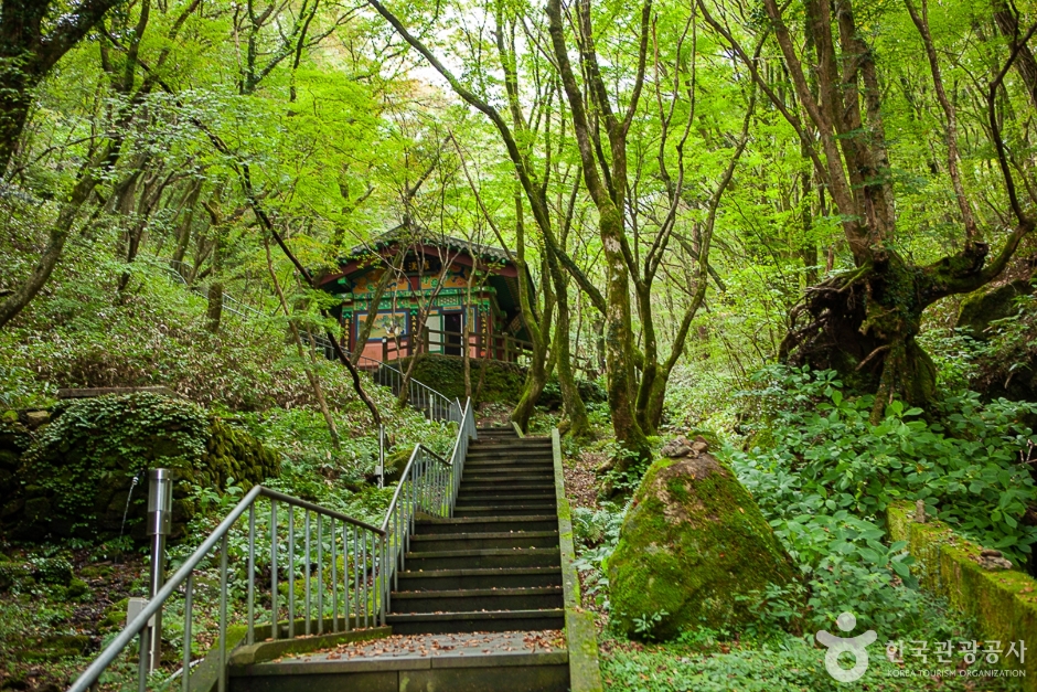 천왕사 뒤편엔 웅장한 용바위, 옆으론 기세 좋게 솟은 바위가 울창한 숲과 어우러져 있고 사찰 앞 계곡을 따라 오르면 한라산 유일의 폭포, 선녀폭포가 반겨줍니다. 이 모든 풍경이 제주에서 보기 드문 단풍의 명소로 손꼽히게 만드는 이유예요.