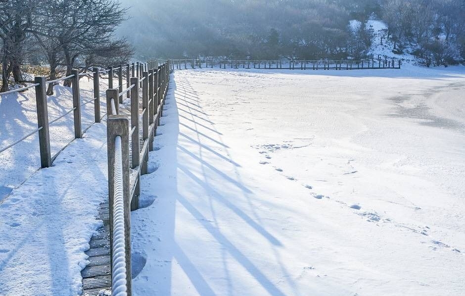 설경 외에도 화구호의 수위에 따라 다른 모습들을 볼 수 있어요. 눈이 많이 오고 녹은 후엔, 물이 차올라 데크가 물에 잠기기도 하죠. 이럴 땐 신발을 벗고 건너는 낭만적인 트레킹이 될 수도 있답니다!