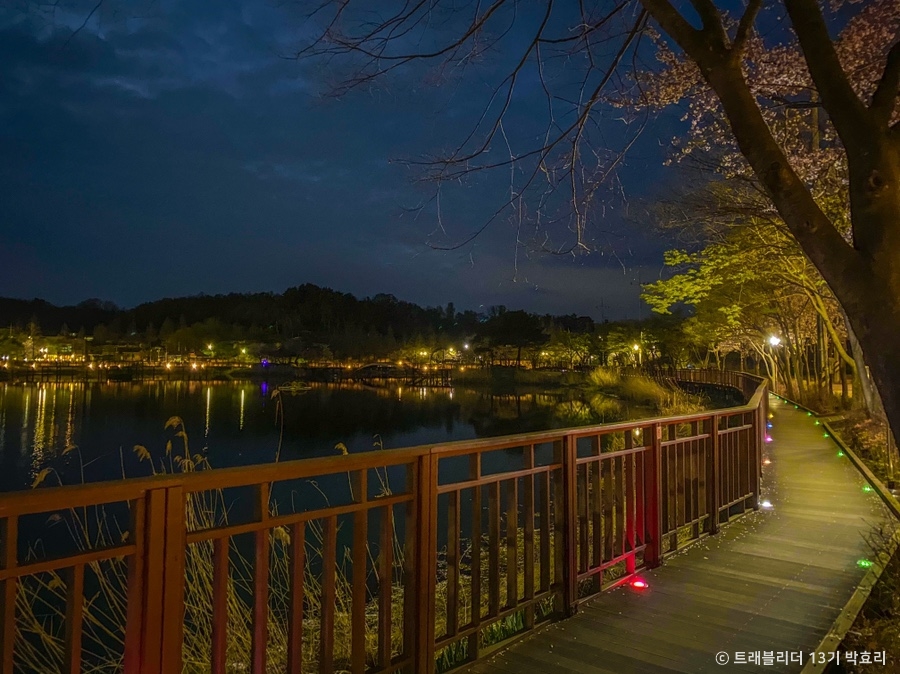 낮에도 예쁘지만 밤의 명덕생태수변공원은 또 다른 분위기를 선사합니다. 바로 구름다리에 설치된 조명 덕분인데요! 밤이 되면 다리를 따라 설치된 알록달록한 조명이 저수지 수면에 반사되며 일렁이는 그림자처럼 아름다운 야경을 만들어냅니다.