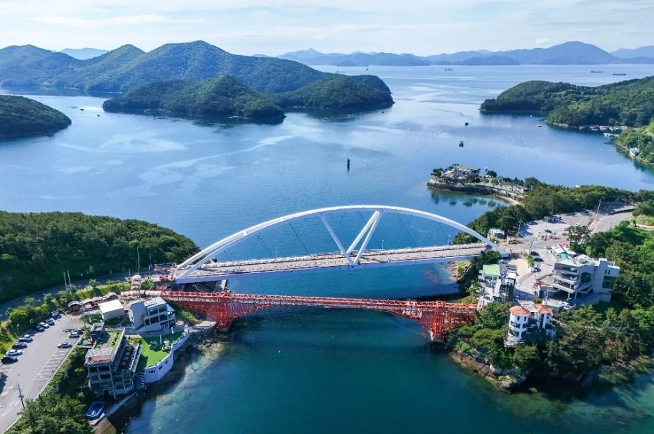 바다 위로 길게 뻗은 다리와 섬의 조화가 만들어내는 풍경은 마치 한 폭의 수채화를 연상케 해요.