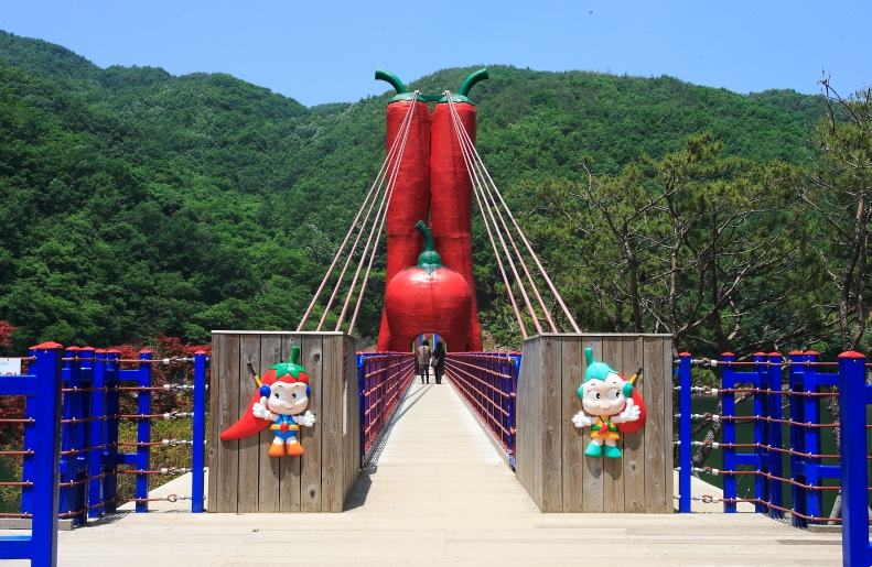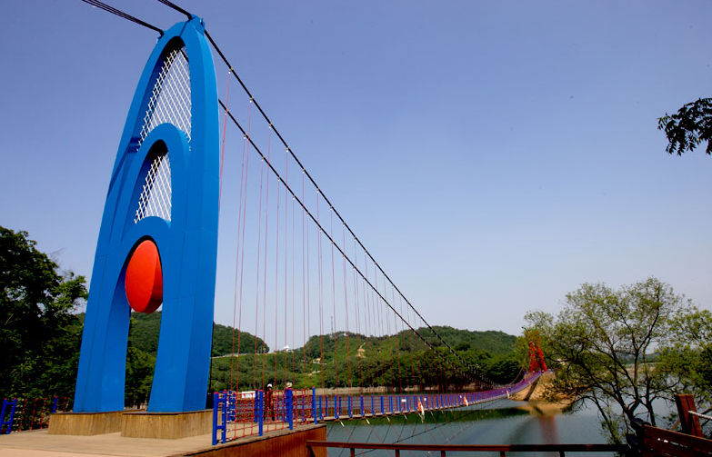 청양의 명물, 천장호 출렁다리를 알고 계신가요? 2009년에 만들어진 이 다리는 우리나라에서 가장 긴 출렁다리로, 길이만 무려 207m에 달합니다! 다리 중간에는 청양의 특산물인 구기자와 고추를 형상화한 주탑이 있으며, 다리를 건너는 순간 짜릿한 스릴을 경험할 수 있습니다.