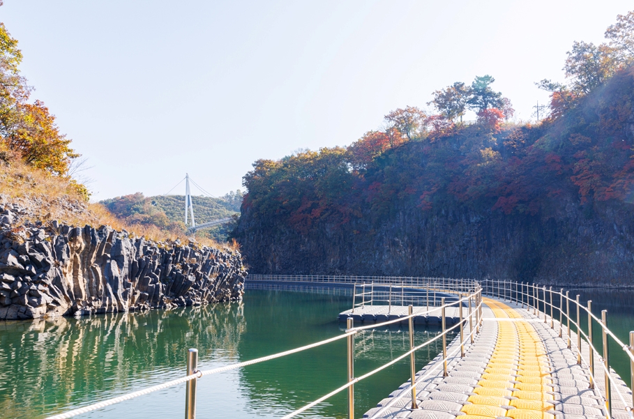 한탄강 물윗길 트레킹 코스는 약 8km에 달하는 거리로 직탕폭포부터 순담계곡까지 이어지는 자연 트레킹 코스예요. 걷는 내내 한탄강의 깎아지른 듯한 주상절리 협곡과 물 위를 따라 떠 있는 부교를 걸으며 비현실적인 풍경을 감상할 수 있답니다. 전체 코스를 모두 걷는 데는 평균 2~3시간 정도가 소요되며, 중간 중간 포토존과 쉼터가 있어 여유롭게 즐기기 좋아요.