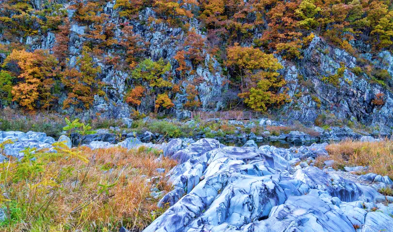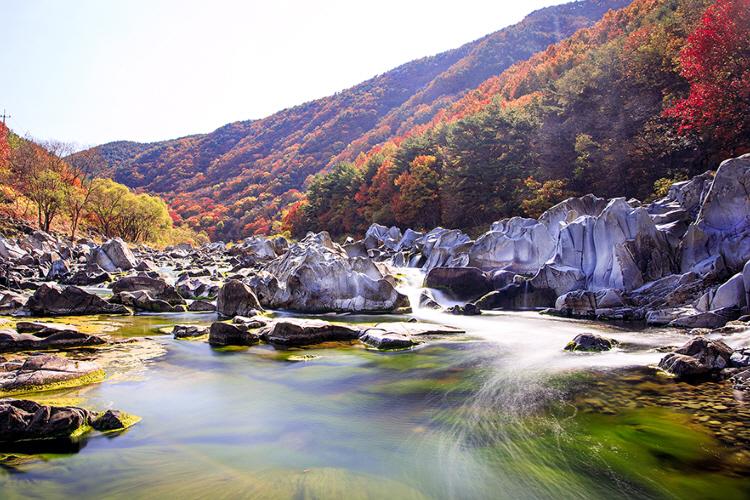백석탄계곡은 이름 그대로 ‘하얀 돌이 반짝이는 개울’이라는 뜻을 가지고 있어요. 수천 년 동안 물이 흘러내려 바위들을 깎아 만든 포트홀 지형은 유네스코 세계지질공원으로서의 가치를 증명하죠.