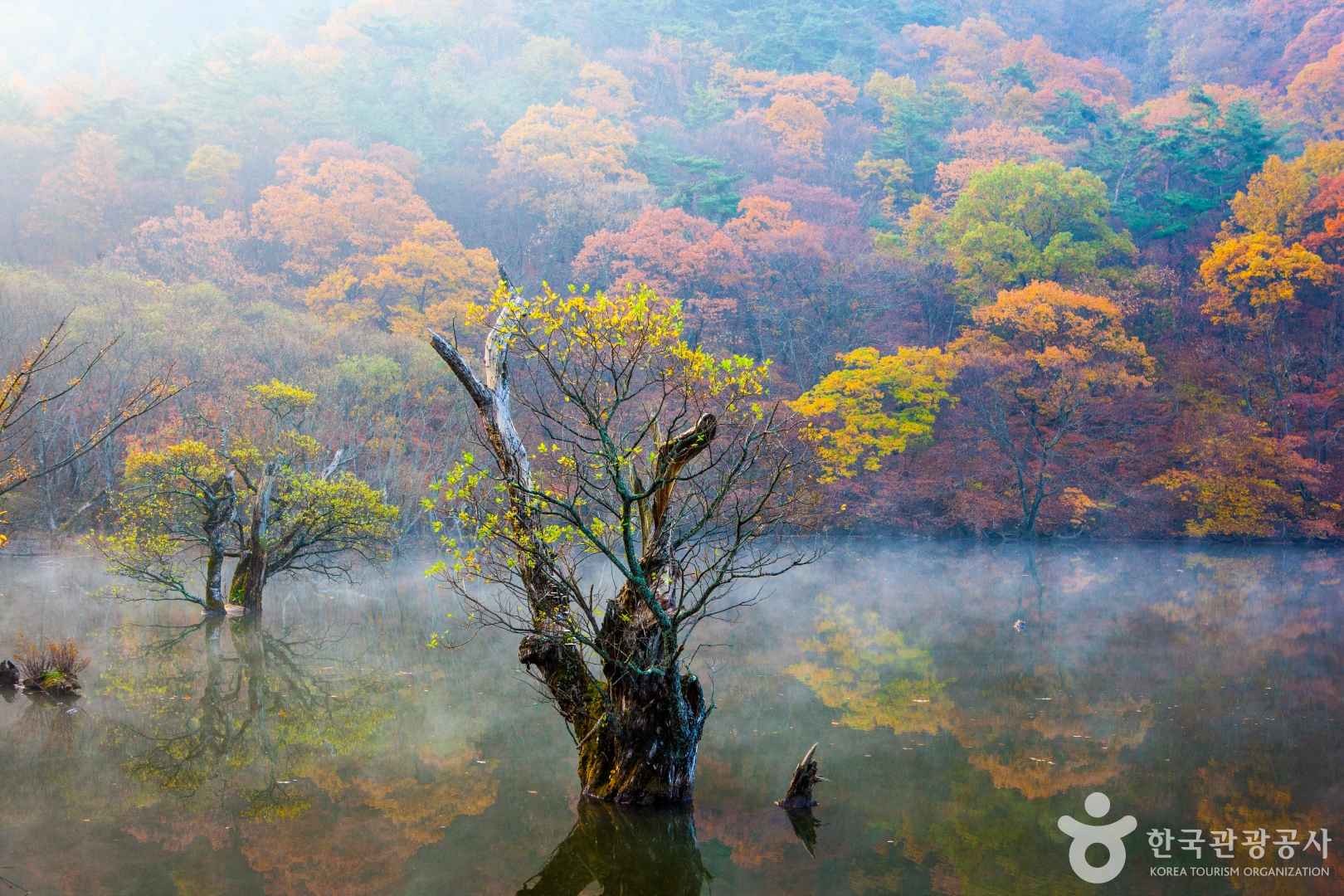 주산지는 단풍과 물안개, 고목나무가 절묘하게 어우러진 풍경으로 사진작가들 사이에서 ‘전설의 촬영지’로 불릴 만큼 유명한 명소입니다. 특히 이른 아침, 물안개가 피어오를 때의 풍경은 세상 어디에도 없는 환상적인 장면을 연출해요. 자연광과 반영이 어우러지는 황금 시간대를 잘 활용하면 감성 폭발 사진을 남길 수 있답니다.