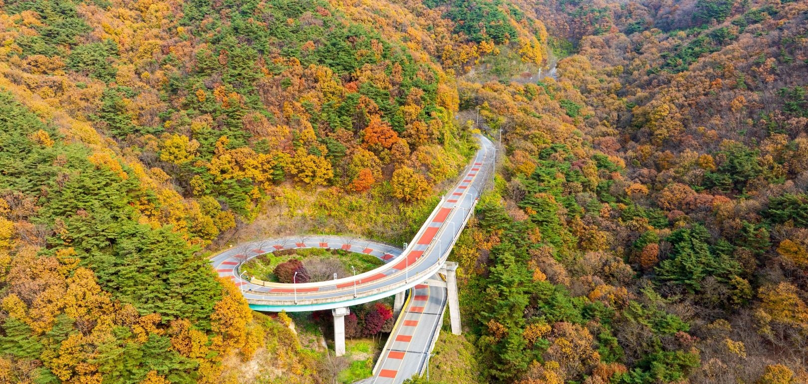 이 도로가 가장 빛나는 순간은 언제일까요? 바로 가을입니다. 단풍으로 붉게 물든 칠갑산 능선을 따라 곡선을 그리는 나선형 도로는 한 폭의 그림 같죠.