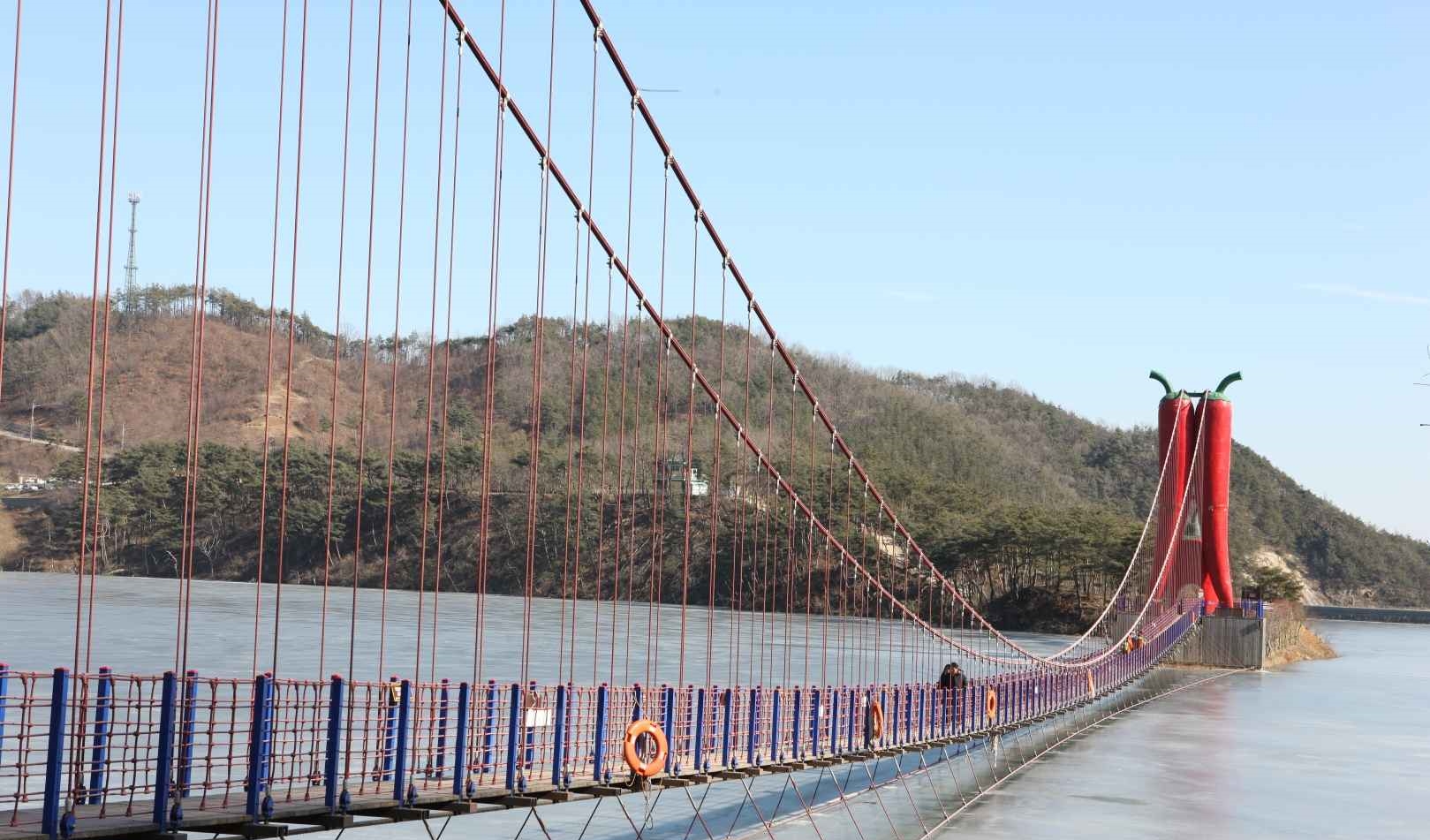 천장호 출렁다리는 2009년 개통된 청양의 대표적인 명소예요. 총 길이 207m, 폭 1.5m의 다리로, 중간에 위치한 주탑은 청양 특산물인 구기자와 고추를 형상화한 독특한 디자인이 인상적이에요.