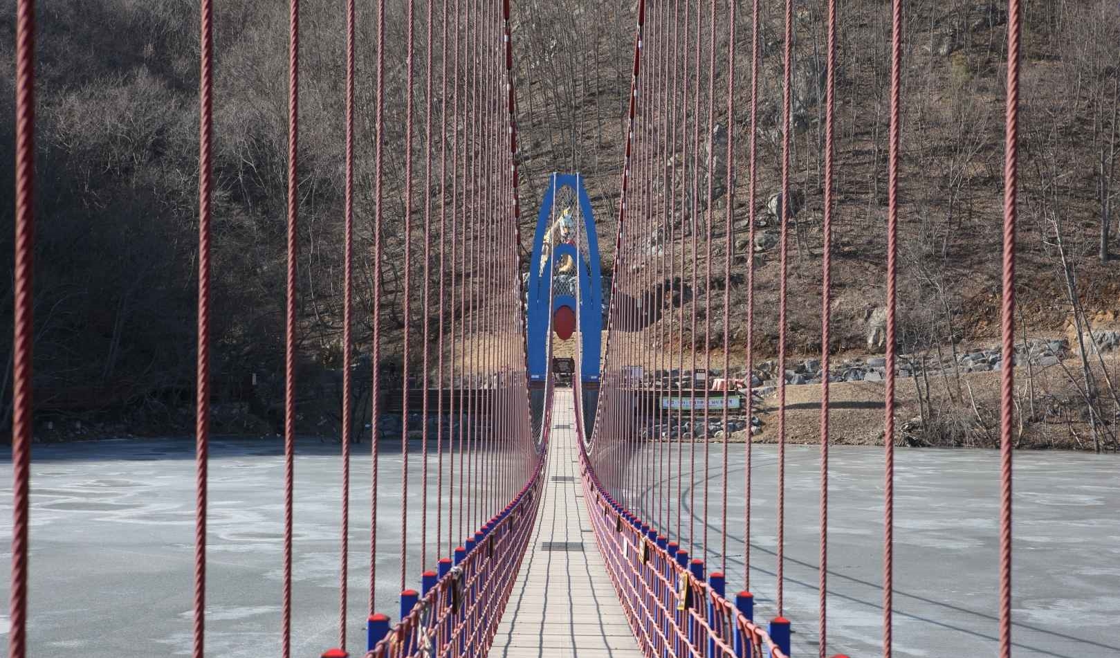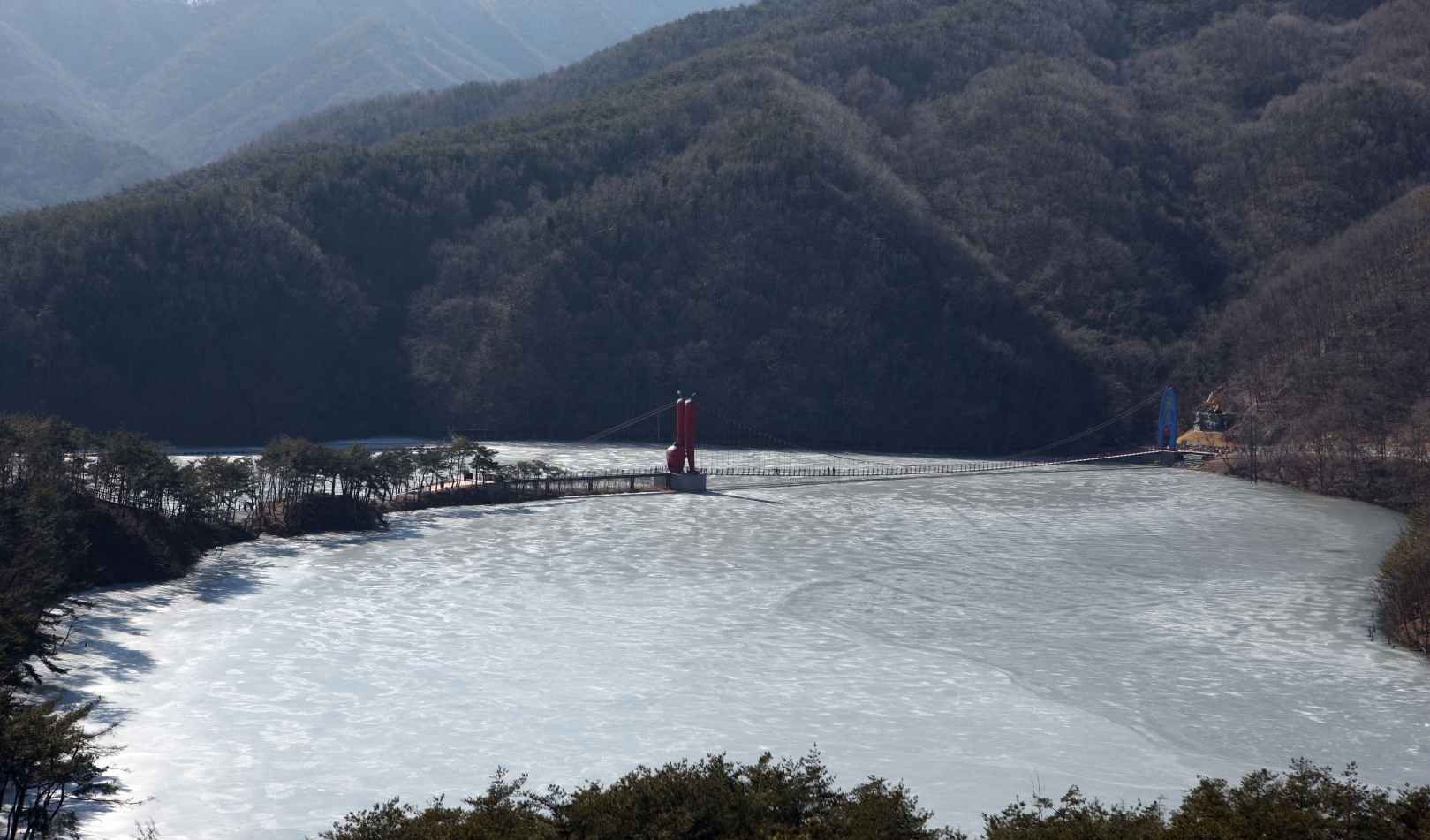 약 20m 정도 걸으면 다리가 상하좌우로 출렁거리기 시작하는데요, 은근한 스릴과 짜릿한 재미를 동시에 경험할 수 있답니다. 특히 겨울에는 다리 아래 호수가 살짝 얼어 반사되는 풍경과 주변 눈 덮인 산세가 더해져 환상적인 설경을 자랑해요.
