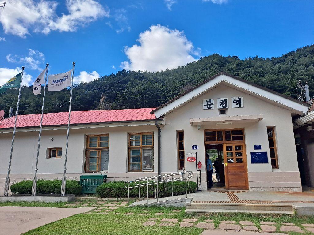 V-트레인은 영주역(경북)부터 철암역(강원 태백)까지 약 27.7km를 천천히 달리는 열차예요. 중간에 정차하는 역은 분천, 양원, 승부, 석포 등으로 총 5~6개의 작은 간이역을 지나며 협곡을 통과합니다.