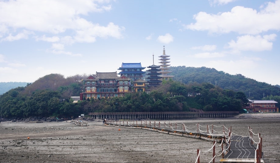 안면암 앞 바다 위에는 특별한 다리가 하나 놓여 있어요. 바로 부교(浮橋)인데요, 물 위에 띄운 부표 위에 목재를 얹어 만든 다리로 흔들흔들 아슬아슬한 느낌이 여행자들의 이색 체험 포인트랍니다. 이 부교를 따라 여우섬까지 걸어가게 되는데요, 물이 빠질 때에는 갯벌에서 생물들을 관찰할 수도 있고, 물이 차오르면 마치 바다 위를 걷는 듯한 독특한 경험을 할 수 있어요. 여우섬을 한 바퀴 천천히 돌아보고 다시 사찰로 돌아올 때 마주하게 되는 안면암의 전경은 또 다른 감동을 선사한답니다.