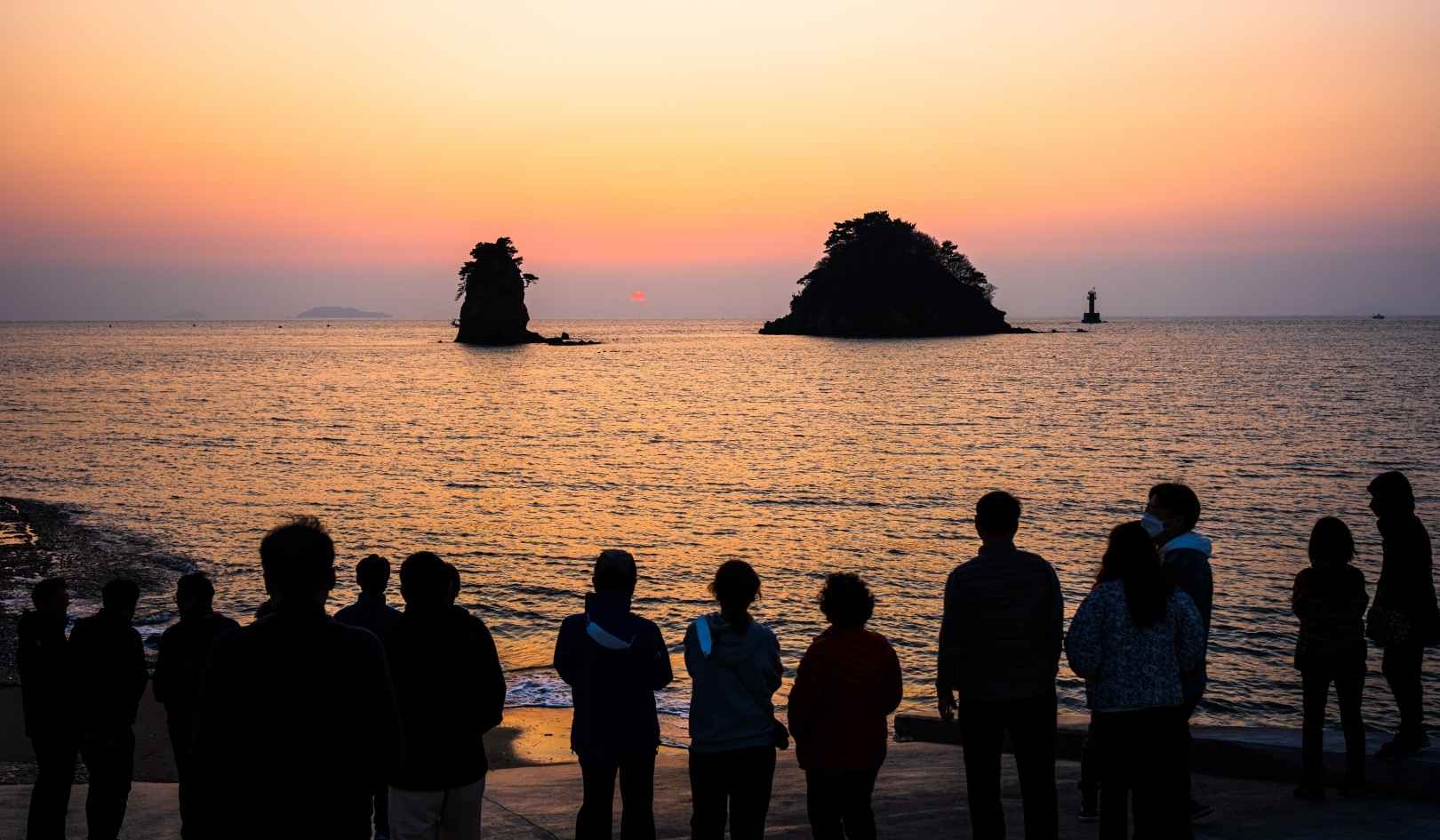 해 질 무렵이면 바다는 붉은빛으로 물들고, 두 바위 사이로 해가 천천히 내려앉는 장면은 그야말로 장관이에요. 이 순간을 카메라에 담기 위해 많은 사람들이 모여들고, 백사장 위는 작은 축제처럼 활기를 띱니다.