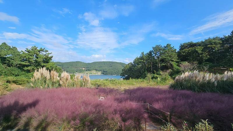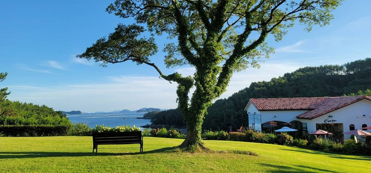 정원 한쪽으로 나 있는 해안 산책길에서는 3면이 바다로 둘러싸인 통영 특유의 절경을 만끽할 수 있어요. 특히 노을 질 무렵, 호수 위로 반사되는 빛과 바다 풍경이 어우러져 한 폭의 수채화처럼 아름답답니다.