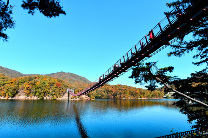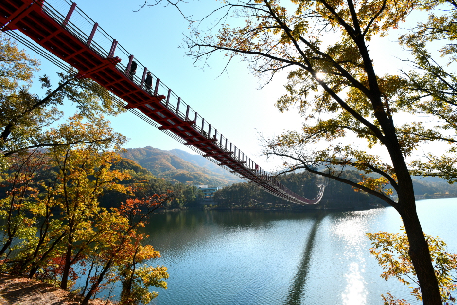 마장호수에서 가장 인기 있는 명소는 단연 출렁다리예요. 길이 220m의 대형 현수교로, 다리를 건너는 순간부터 아찔하게 출렁이는 느낌이 재미를 더해줘요. 특히 가을엔 다리 양 옆으로 단풍이 붉게 물들어 마치 단풍터널을 걷는 듯한 기분을 느낄 수 있답니다. 살짝 스릴도 있고, 감성도 가득한 이곳! 셀카, 풍경 사진 모두 인생샷 명소로도 추천해요 📷