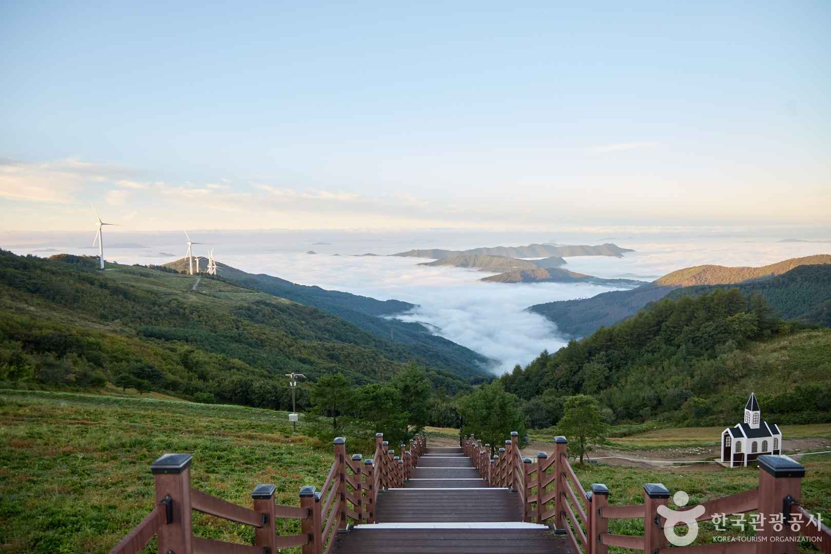 육백마지기의 황금 시즌은 6월~7월! 이 시기에는 ‘계란프라이꽃’이라고 불리는 샤스타데이지가 초지를 하얗게 수놓으며, 몽환적이고 로맨틱한 분위기를 자아내요. 드론으로 촬영하면 마치 유럽 알프스 고원에 와 있는 듯한 착각이 들 정도로 풍경이 어마어마하게 아름답습니다. 계절에 따라 야생화 생태단지산 전망대, 조형물이 함께 어우러져 어디서 사진을 찍든 인생샷이 보장되는 장소랍니다.