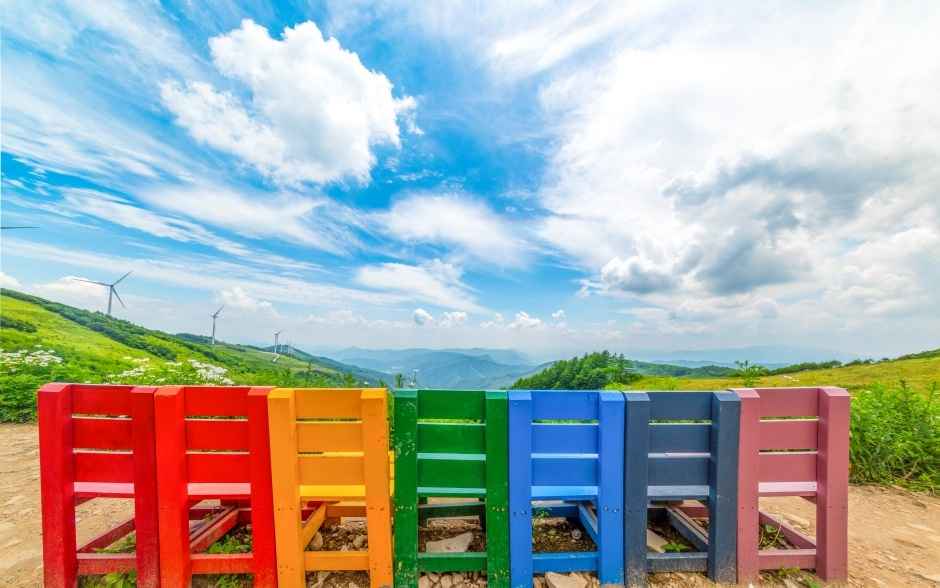 푸른 초원을 배경으로 색색의 의자가 놓여 있는 이곳은 감성 사진을 남기기에 딱 좋은 곳이에요.