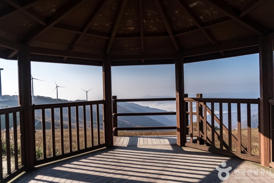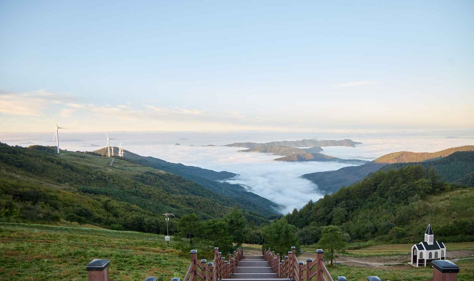 청옥산 전망대에 오르면 육백마지기 초원과 20기의 거대한 풍력발전기가 돌아가는 장관을 동시에 볼 수 있어요. 바람을 따라 유유히 회전하는 터빈의 소리는 생각보다 조용하고, 그 모습이 푸른 능선과 어우러져 묘한 평화로움을 줍니다. 특히 이곳은 사계절 내내 매력적인데, 여름엔 야생화와 푸른 초원, 가을엔 억새와 노을, 겨울엔 하얀 설경까지 어떤 계절에 가도 만족스럽답니다.