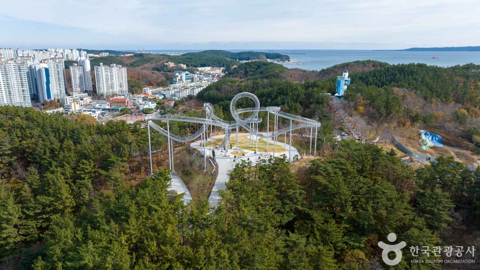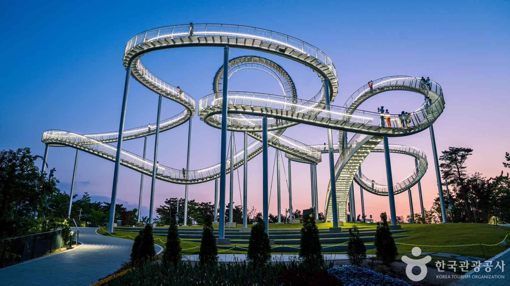포항 영일대해수욕장 끝자락, 해안마을 뒷산에 자리한 이곳은 바다와 숲, 문화공간이 공존하는 힐링 스팟이에요. 공원 내에는 포항시립미술관, 야외공연장, 어린이도서관, 전통놀이공원, 분수대 등 다양한 시설이 있고, 특히 가장 주목받는 곳은 단연 '스페이스워크'입니다! 총 길이 333m, 계단 수 717개로 구성된 대형 조형물로 하늘 위를 걷는 듯한 아찔한 체험이 가능해요. 바람이 세거나 우천 시엔 안전상 입장이 제한되니 방문 전 참고하세요.
