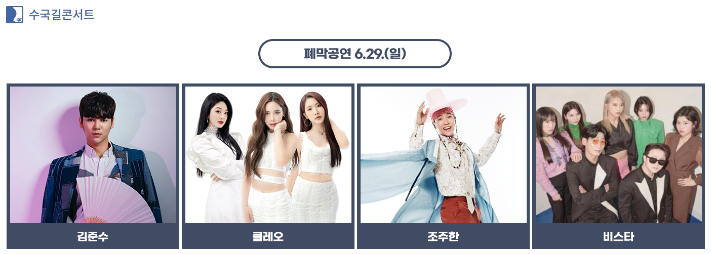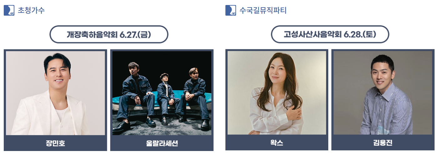 | 🌟 공식행사 | 개막식(6/27), 오프닝 콘서트 (장민호, 울랄라세션 등) |