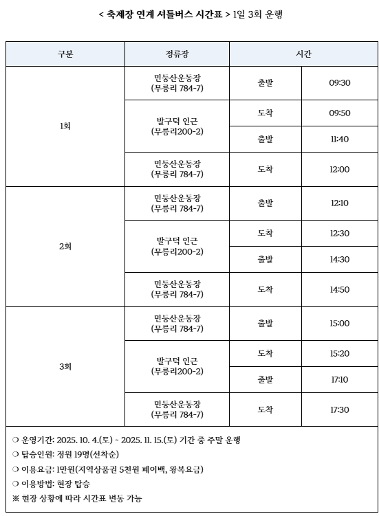 ⚠️ 주의: 셔틀버스는 2025년 10월 4일부터 11월 15일까지의 주말에만 운영되며, 정원 19명으로 선착순 탑승입니다. 시간표는 현장 상황에 따라 변동될 수 있어요!