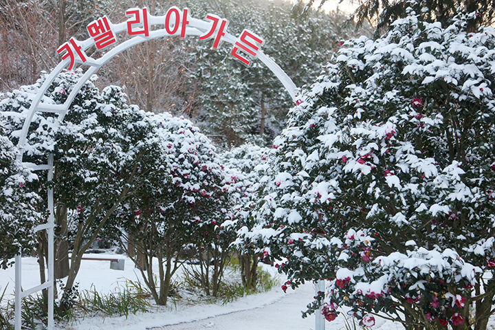 겨울이지만 붉은 꽃잎이 수놓은 이 길은 ‘겨울 정원 속 봄 풍경’이라는 표현이 절로 나올 만큼 이색적인 분위기를 자아냅니다.