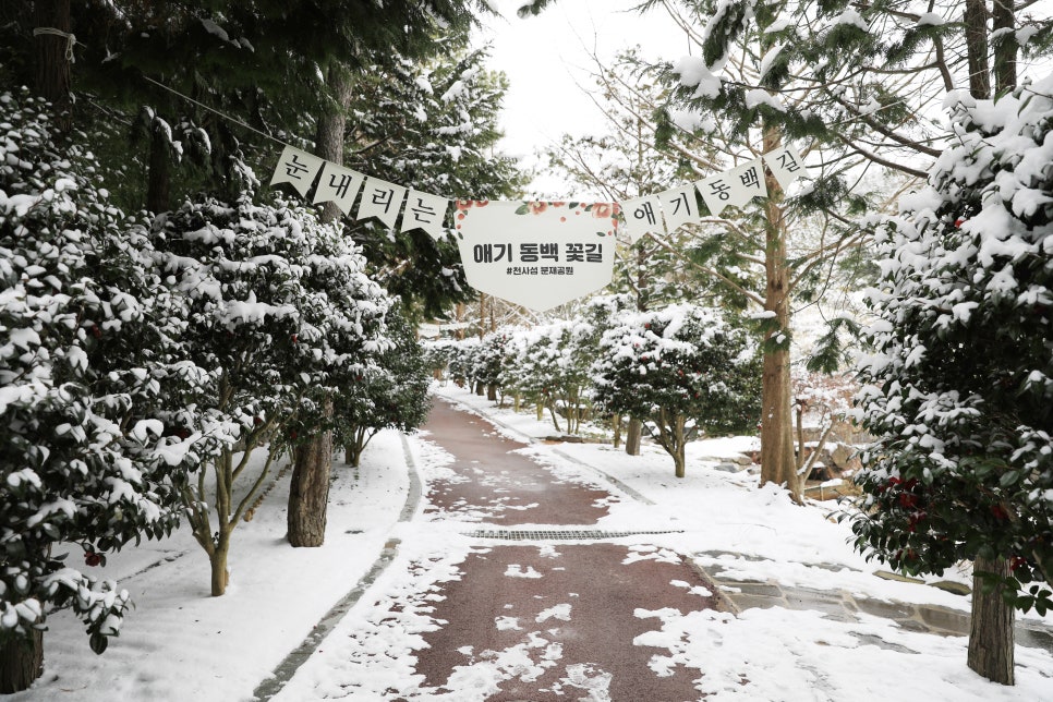 분재정원 내에는 2만 그루의 애기동백나무가 심어진 약 3km 길이의 동백숲길이 조성돼 있어요.