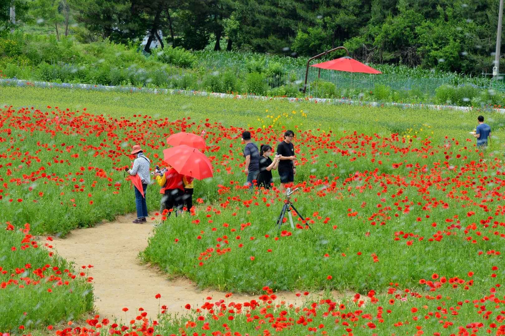눈앞에 펼쳐지는 꽃양귀비의 붉은 물결은 그 자체로 예술이지만, 축제장 곳곳에는 인생샷 명소 포토존이 따로 마련되어 있어요 📷 특히 빨간 우산, 꽃문, 나무 액자 프레임과 함께 찍으면 마치 동화 속 한 장면처럼 아름다운 결과물을 남길 수 있어요.