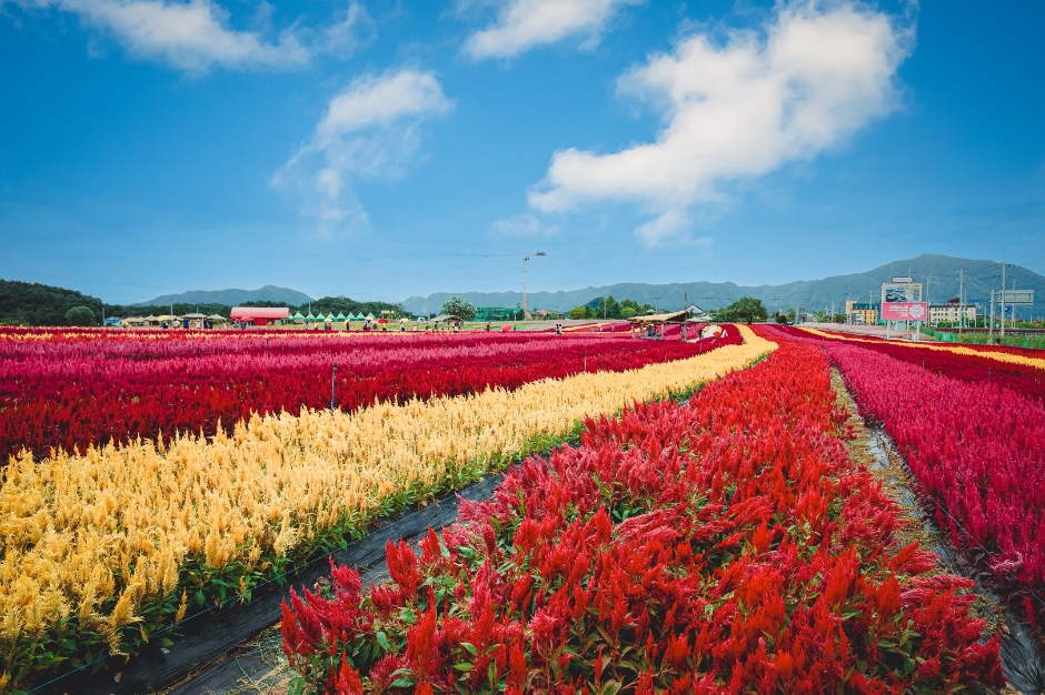 해바라기 밭에는 초대형 액자 프레임이 설치되어 있어 사진 찍기에도 아주 좋고요, 붉은 맨드라미가 둘러싸인 산책 데크길은 드라마 속 한 장면 같은 풍경을 연출합니다.