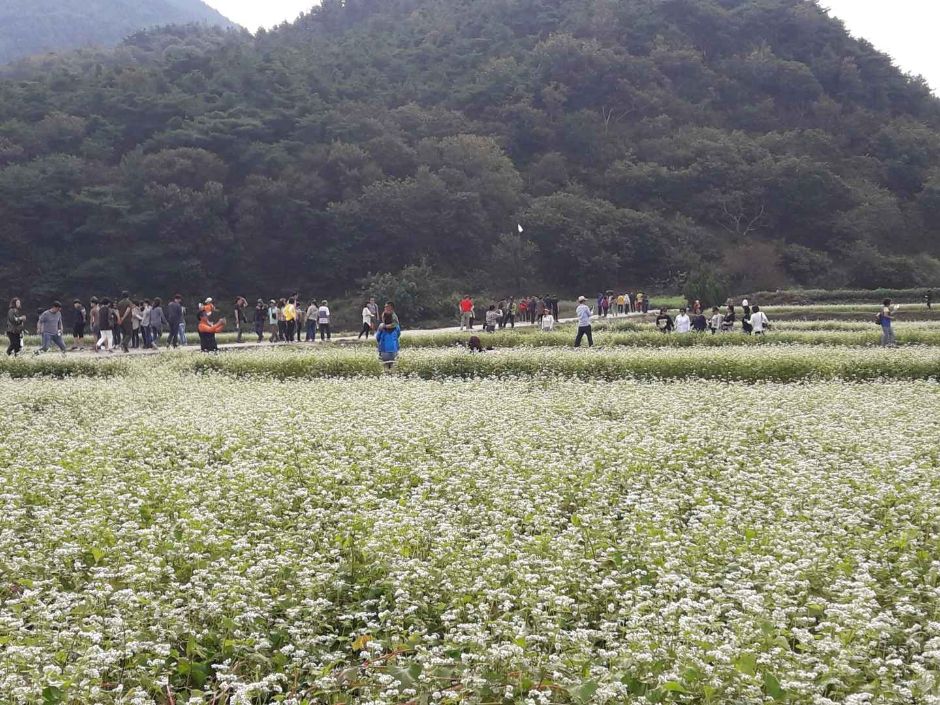 네! 포토존이 곳곳에 설치되어 있어 인생샷을 남기기에 좋아요. 특히 코스모스길과 메밀꽃 밭 사이가 인기랍니다.