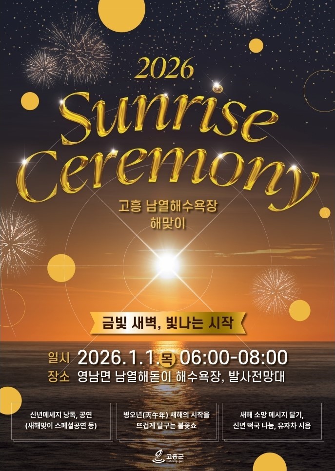 2026년 새해 아침을 여는 특별한 순간! 고흥군은 ‘병오년 붉은 말의 해’를 맞아 1월 1일 오전 6시부터 8시까지 남열해돋이해수욕장에서 해맞이 행사를 개최합니다. 이번 행사는 “고흥의 금빛 새벽, 모두의 소망을 채우다”라는 주제로 약 5,000명의 군민과 관광객이 함께하는 큰 축제로 기대를 모으고 있어요.